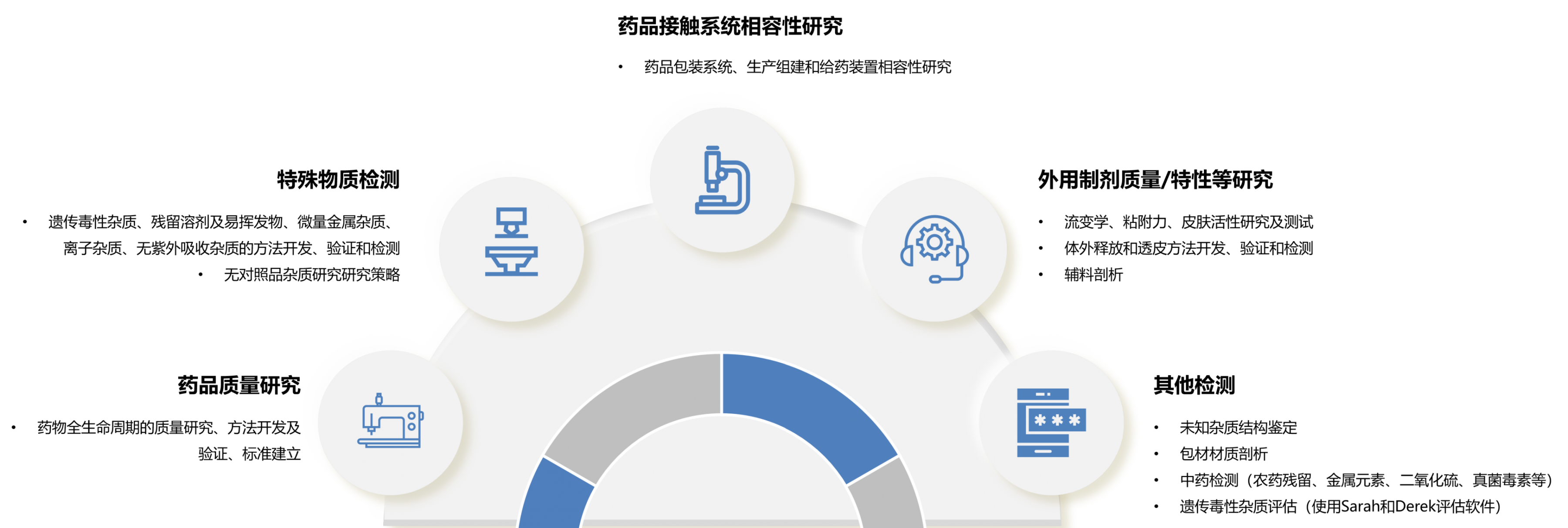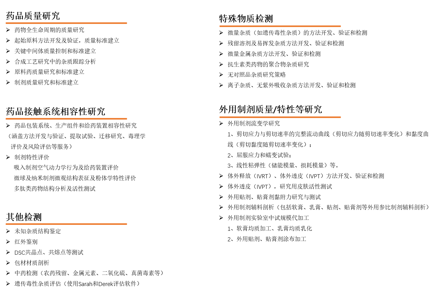 基于公司(集團(tuán))先進(jìn)的檢測(cè)設(shè)備和完善的質(zhì)量管理體系,能夠幫助項(xiàng)目組完成復(fù)雜化合物檢測(cè)方法的開(kāi)發(fā)、相容性研究(包材、給藥裝置、生產(chǎn)組件等)及特殊雜質(zhì)的檢測(cè)(元素雜質(zhì)、遺傳毒雜質(zhì)、金屬離子、聚合物等)。