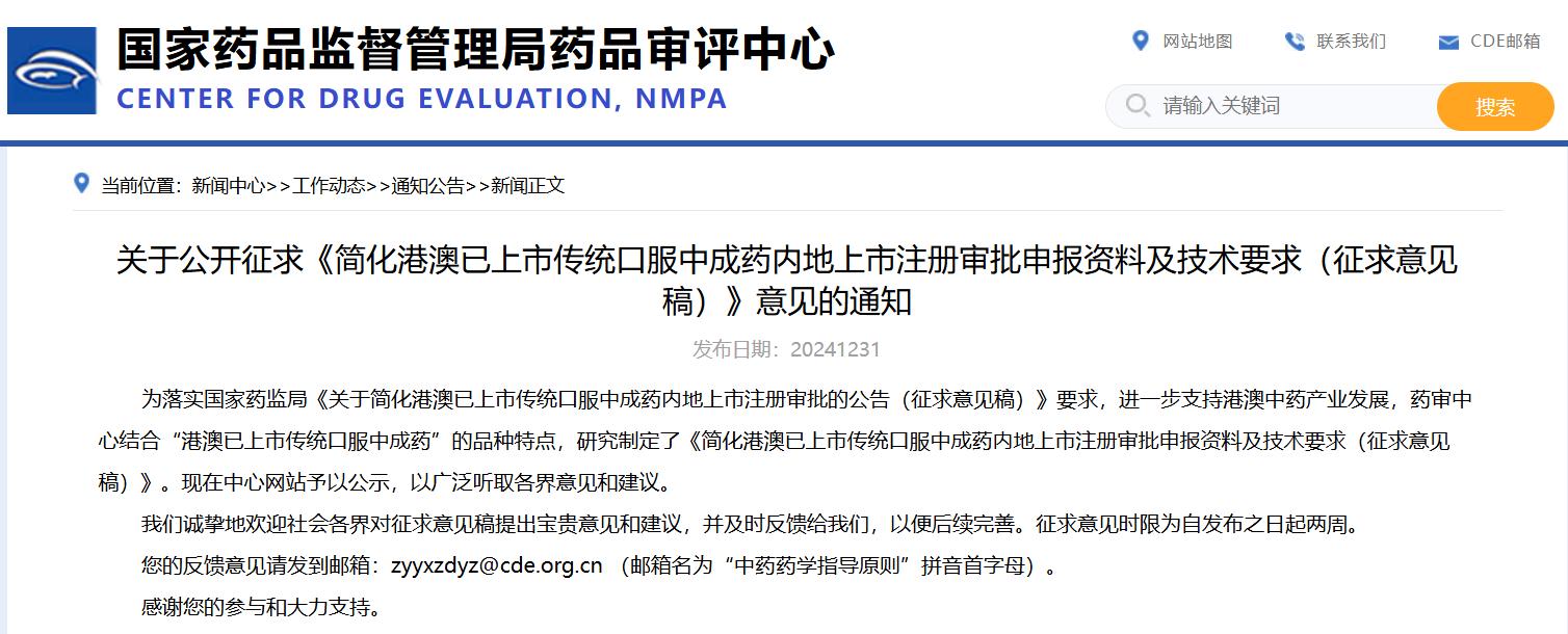 關(guān)于公開征求《簡化港澳已上市傳統(tǒng)口服中成藥內(nèi)地上市注冊審批申報(bào)資料及技術(shù)要求(征求意見稿)》意見的通知