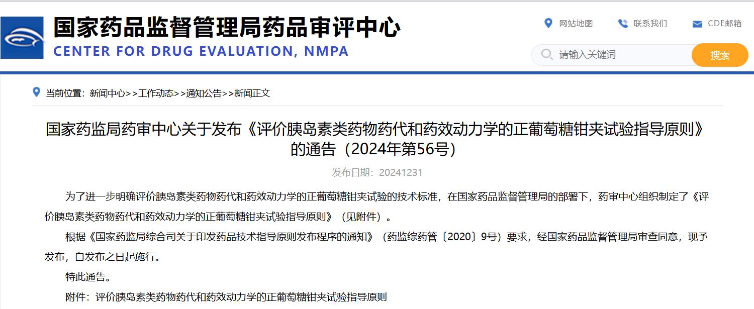 國家藥監(jiān)局藥審中心關(guān)于發(fā)布《評價(jià)胰島素類藥物藥代和藥效動(dòng)力學(xué)的正葡萄糖鉗夾試驗(yàn)指導(dǎo)原則》的通告(2024年第56號)