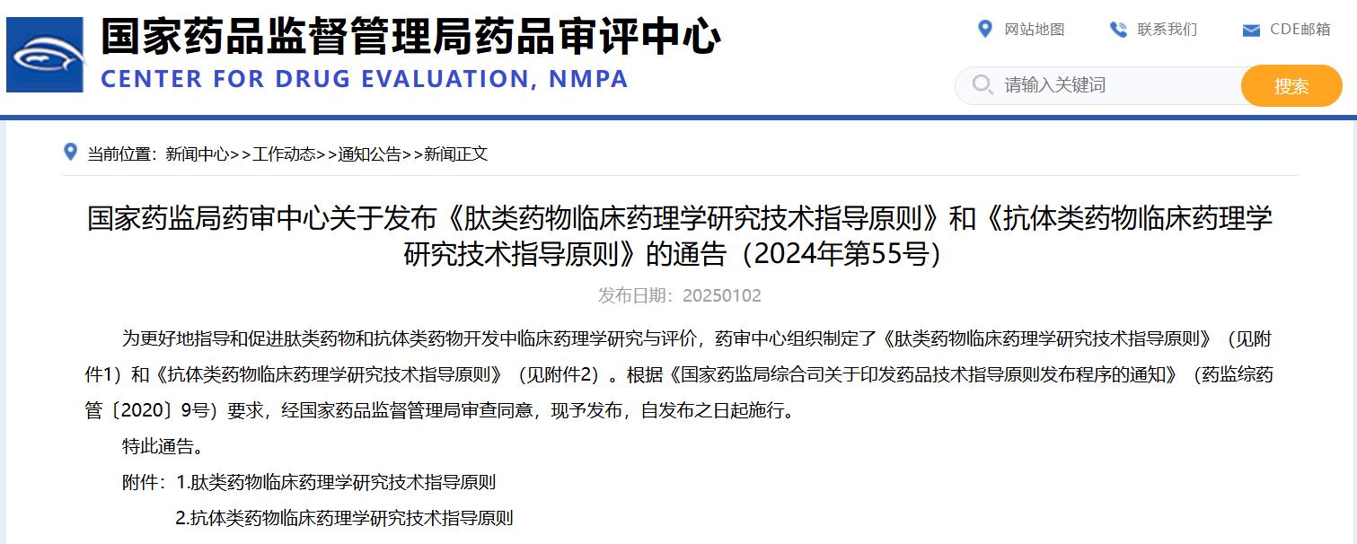 國家藥監(jiān)局藥審中心關(guān)于發(fā)布《肽類藥物臨床藥理學(xué)研究技術(shù)指導(dǎo)原則》和《抗體類藥物臨床藥理學(xué)研究技術(shù)指導(dǎo)原則》的通告(2024年第55號)