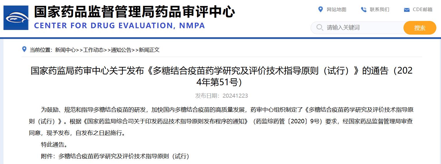 國家藥監(jiān)局藥審中心關(guān)于發(fā)布《多糖結(jié)合疫苗藥學(xué)研究及評價(jià)技術(shù)指導(dǎo)原則(試行)》的通告(2024年第51號)