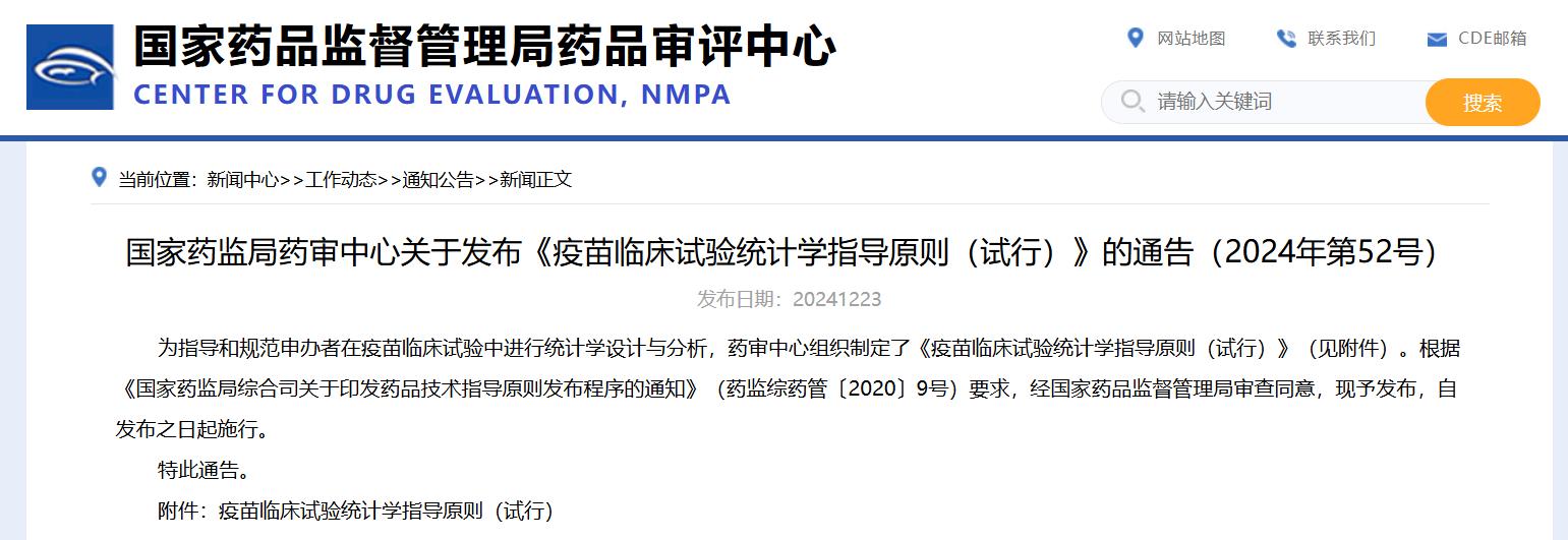 國家藥監(jiān)局藥審中心關(guān)于發(fā)布《疫苗臨床試驗(yàn)統(tǒng)計(jì)學(xué)指導(dǎo)原則(試行)》的通告(2024年第52號)
