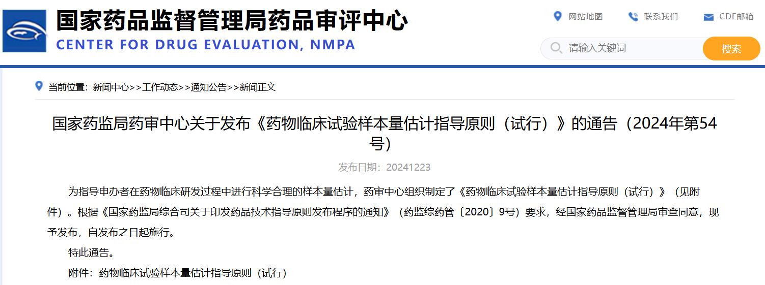 國家藥監(jiān)局藥審中心關(guān)于發(fā)布《藥物臨床試驗(yàn)樣本量估計(jì)指導(dǎo)原則(試行)》的通告(2024年第54號)