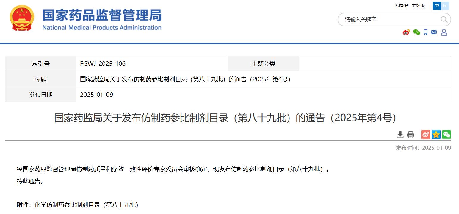 國家藥監(jiān)局關(guān)于發(fā)布仿制藥參比制劑目錄(第八十九批)的通告(2025年第4號)