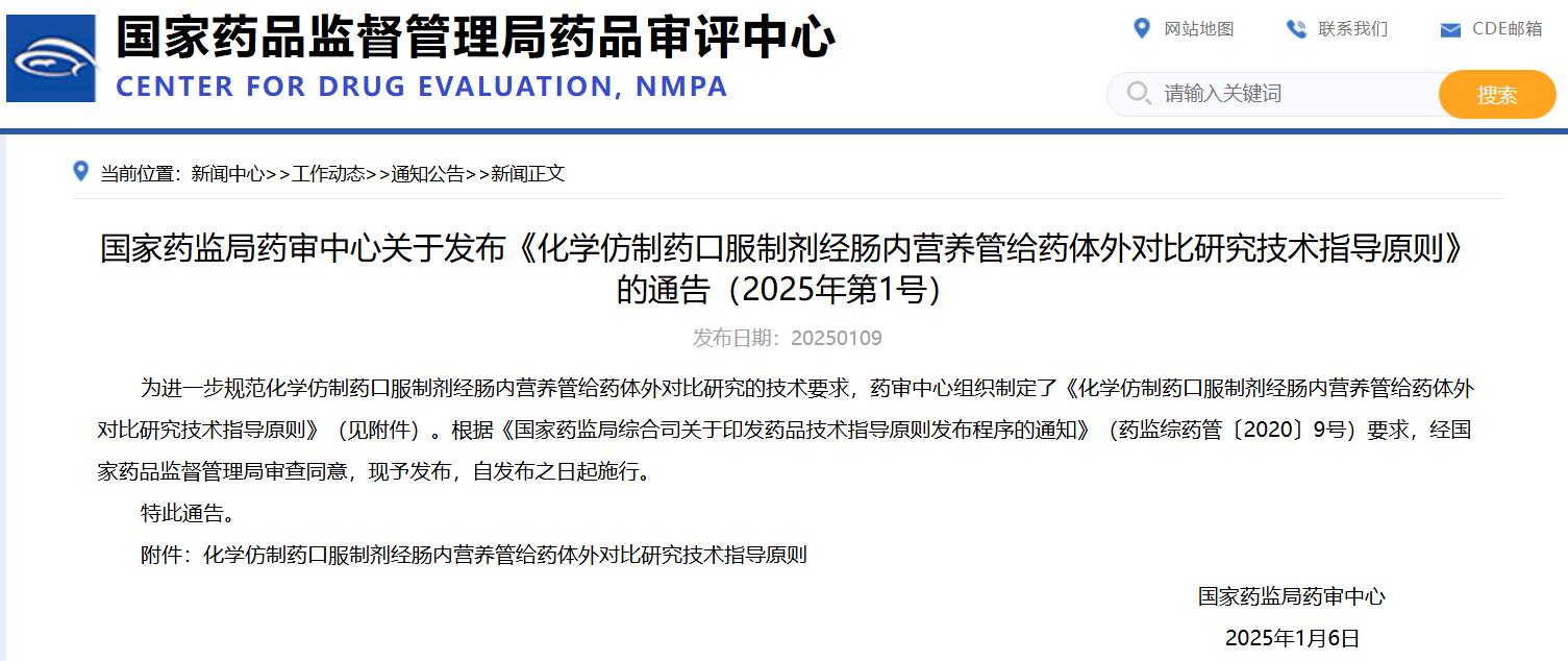 國家藥監(jiān)局藥審中心關(guān)于發(fā)布《化學(xué)仿制藥口服制劑經(jīng)腸內(nèi)營養(yǎng)管給藥體外對比研究技術(shù)指導(dǎo)原則》的通告(2025年第1號)