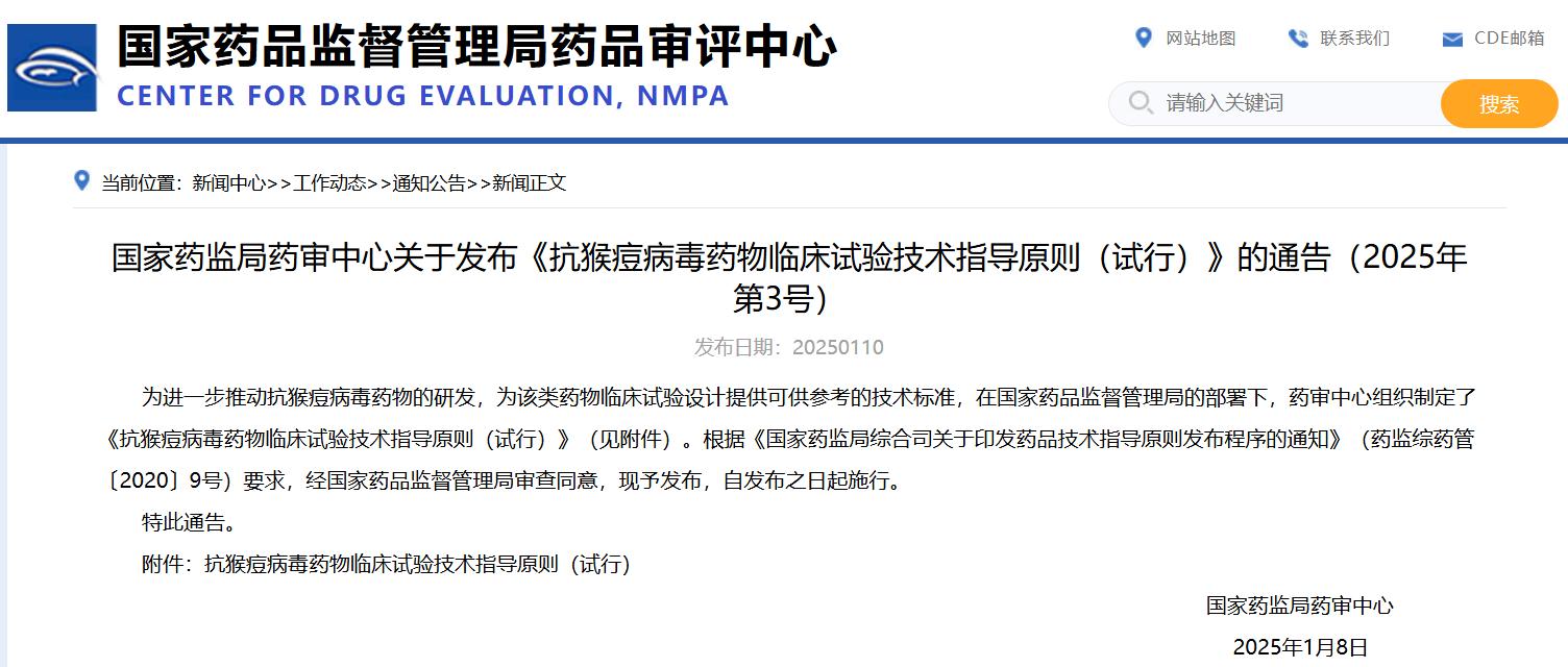 國家藥監(jiān)局藥審中心關(guān)于發(fā)布《抗猴痘病毒藥物臨床試驗技術(shù)指導(dǎo)原則(試行)》的通告(2025年第3號)