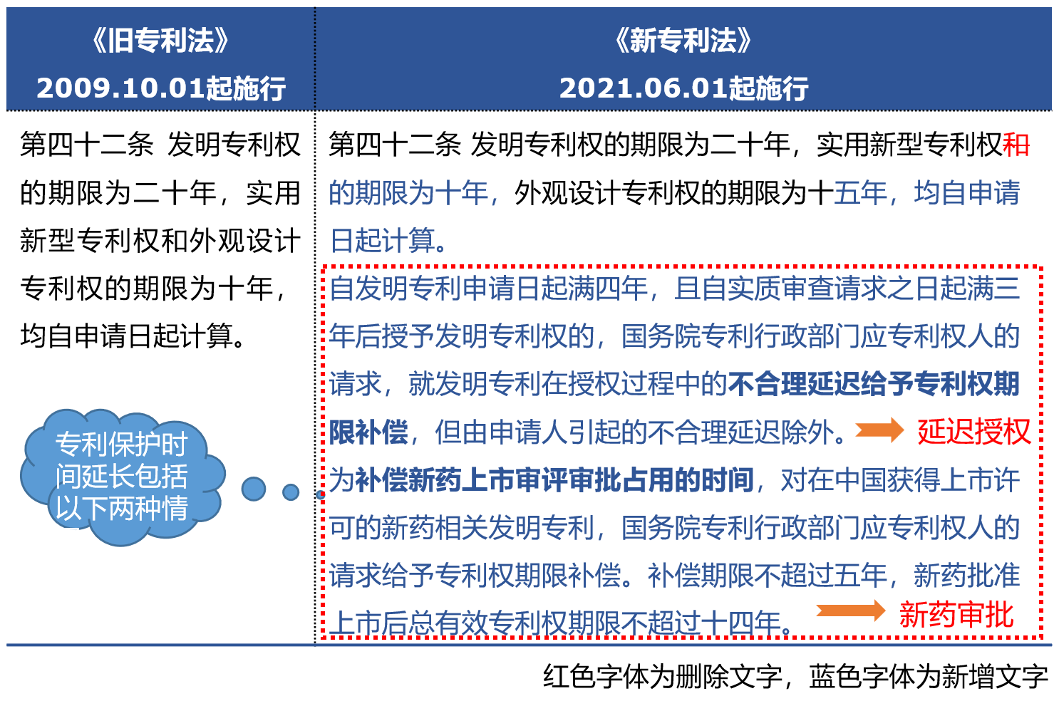 第三款中規(guī)定,為補償新藥上市審評審批占用的時間,對在中國獲得上市許可的新藥相關發(fā)明專利,國務院專利行政部門應專利權人的請求給予專利權期限補償。補償期限不超過五年,新藥批準上市后總有效專利權期限不超過十四年。