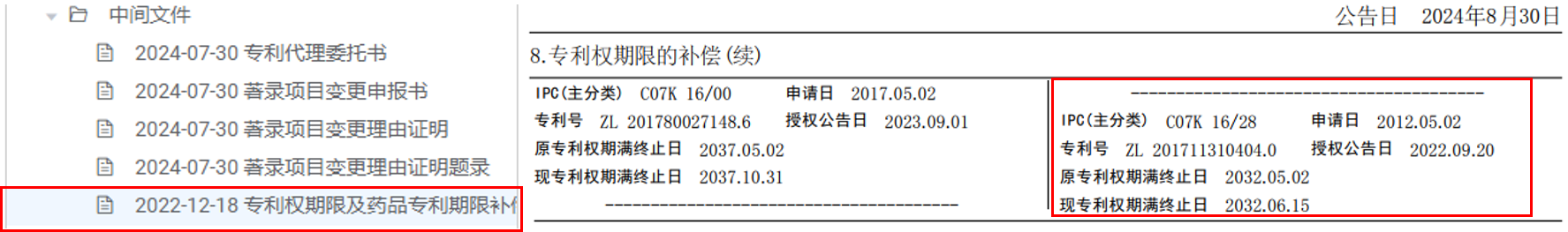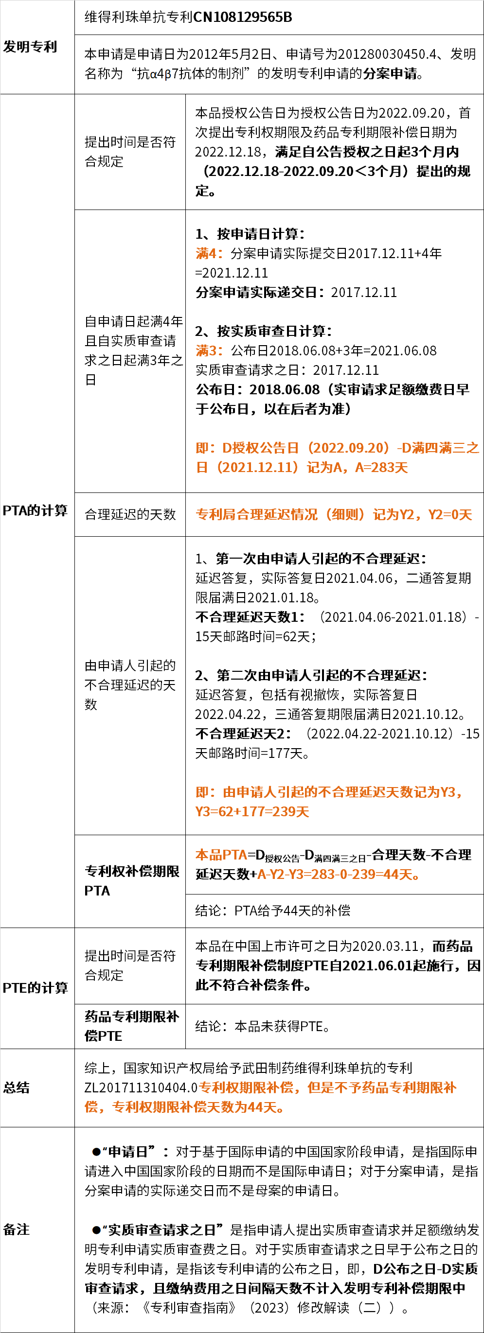 下面通過案例來更深入了解專利權期限補償,維得利珠單抗專利為國內(nèi)首批獲得專利權期限補償審批的發(fā)明專利,但未獲得藥品專利期限補償。
