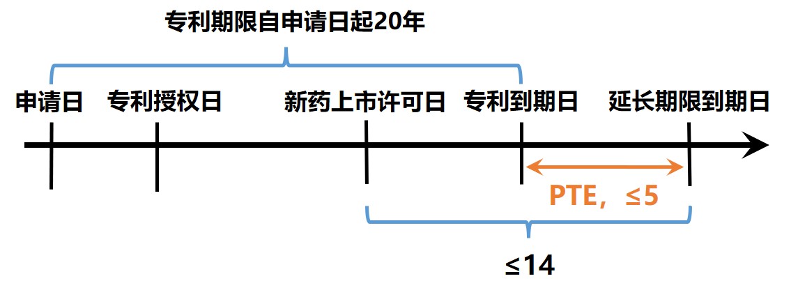 ● 美國:PTE=臨床研究時間的1/2+注冊審批時間;整個專利期限恢復≤5年,并且在FDA批準NDA后,剩余的專利期限≤14年。