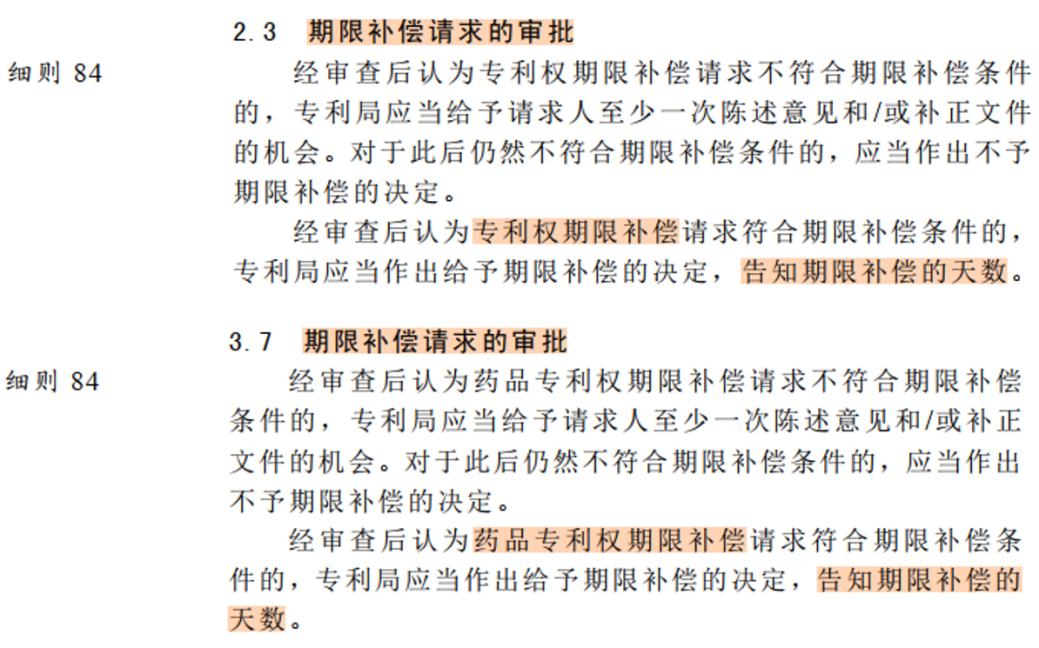 《審查指南》第五部分第九章2.3和3.7期限補償請求的審批作出如下規(guī)定,經(jīng)審查后認為專利權期限補償請求符合期限補償條件的,均由專利局作出期限補償?shù)臎Q定,并告知期限補償?shù)奶鞌?shù)。