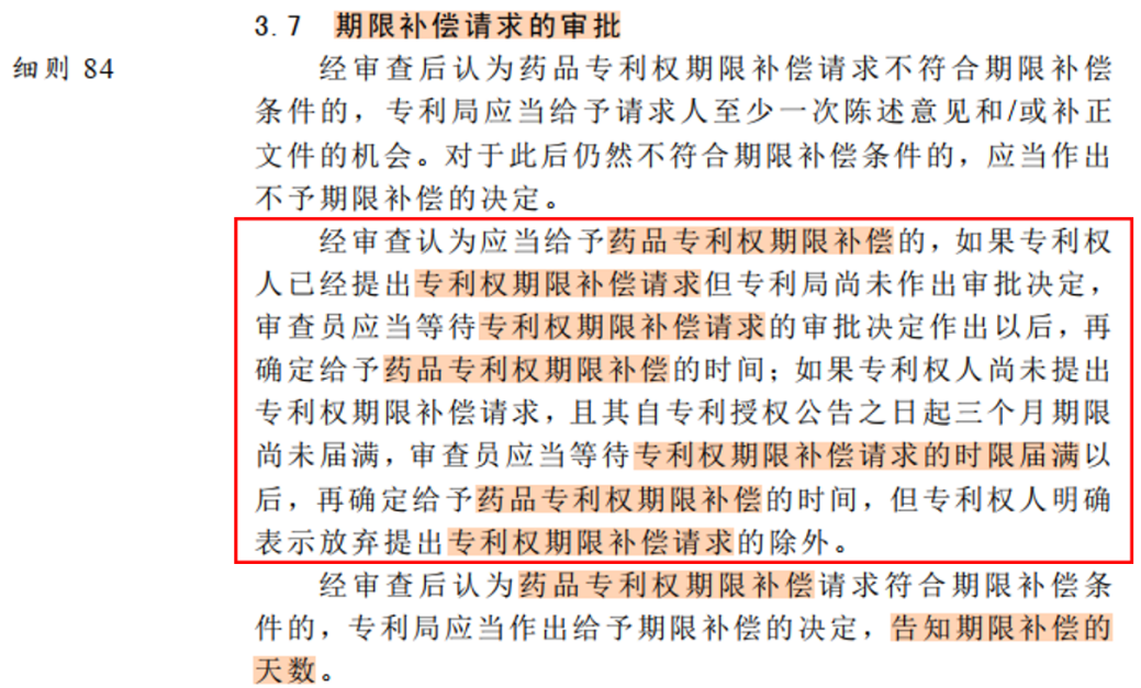 經(jīng)批準認為應當給予藥品專利權期限補償請求的,如果專利權人已經(jīng)提出專利權期限補償請求但專利局尚未審批決定,審查員應當?shù)却龑@麢嗥谙扪a償請求的審批決定作出以后,再確定給予藥品專利權期限補償?shù)臅r間;如果專利權人尚未提出專利權期限補償請求,且其自專利授權公告之日起三個月期限尚未屆滿,審查員應當?shù)却龑@麢嗥谙扪a償請求的時限屆滿以后,再確定給予藥品專利權期限補償請求的時間,但專利權人明確表示放棄提出專利權期限補償請求除外。