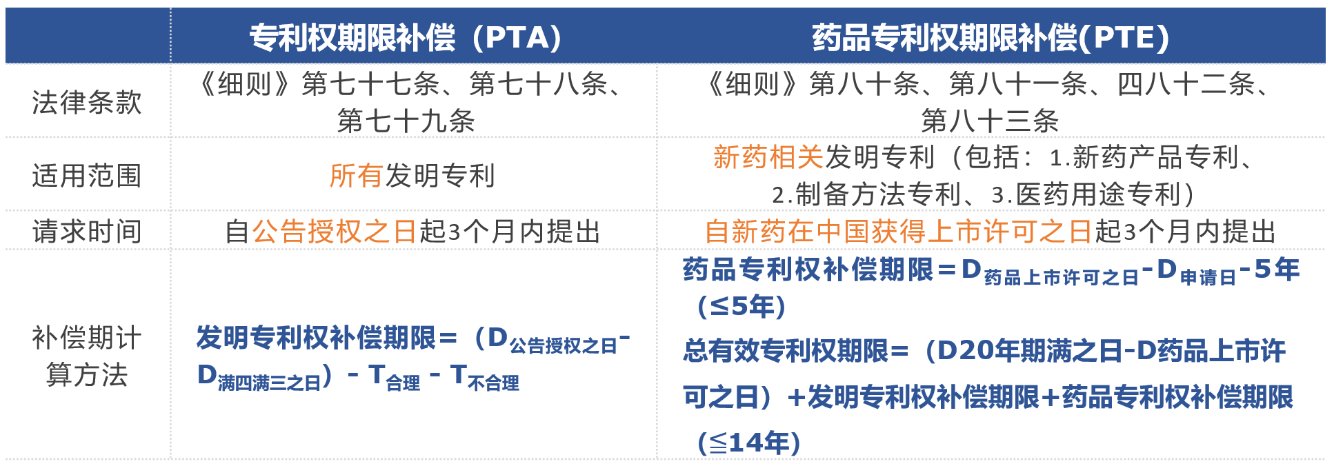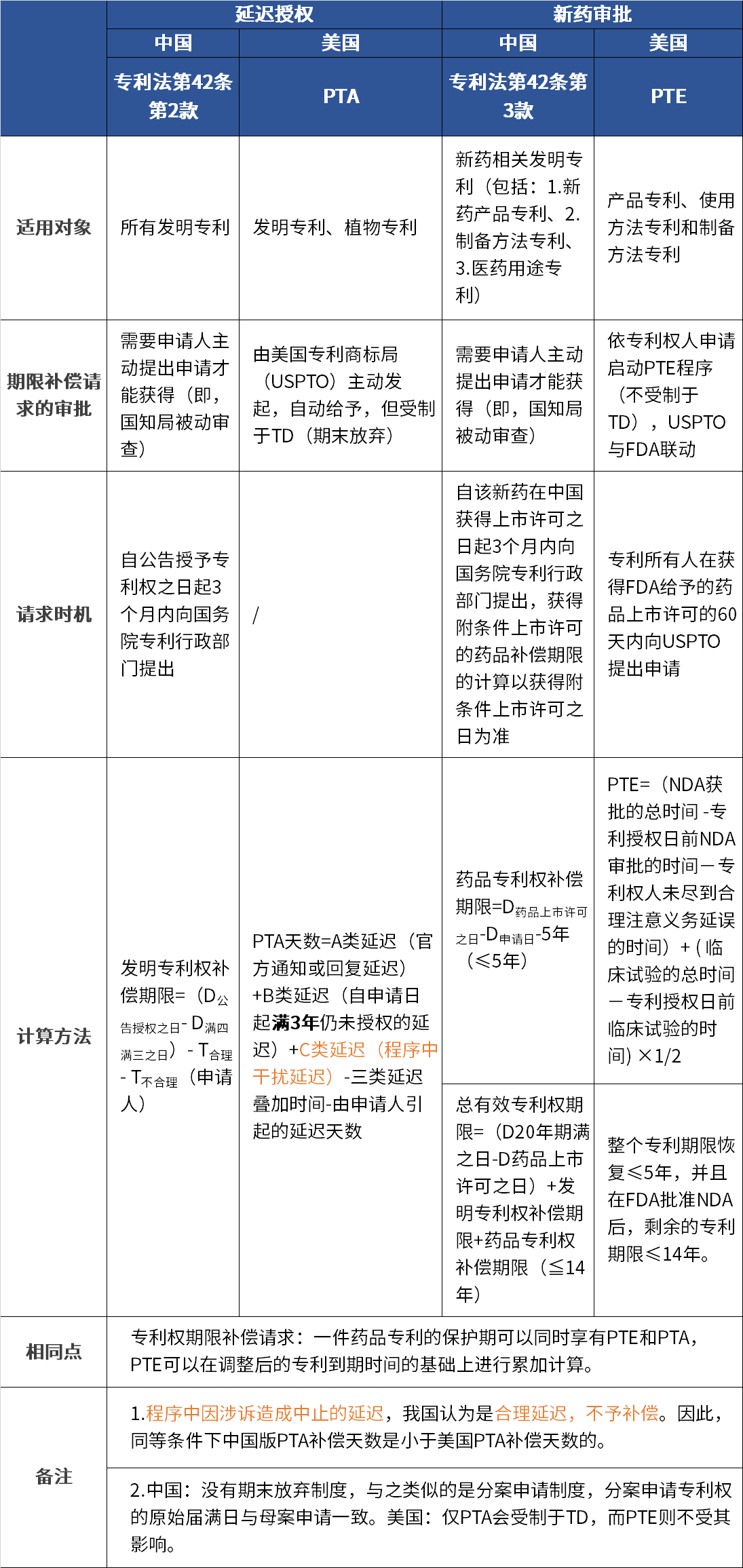 為了更直觀對比專利權期限補償(PTA)和藥品專利權期限補償(PTE)的區(qū)別,列出如下表格: