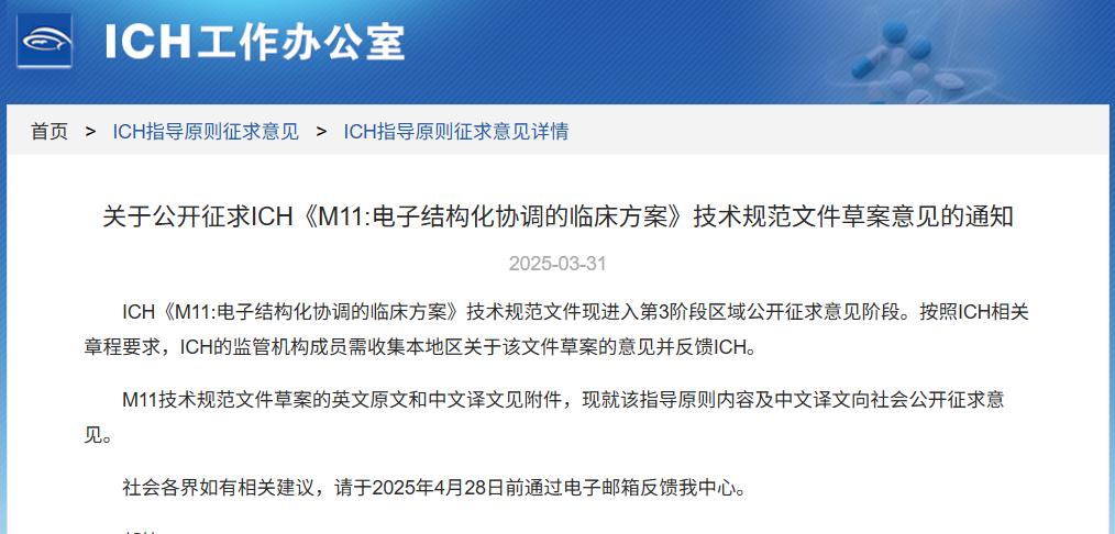 關于公開征求ICH《M11:電子結構化協(xié)調的臨床方案》技術規(guī)范文件草案意見的通知