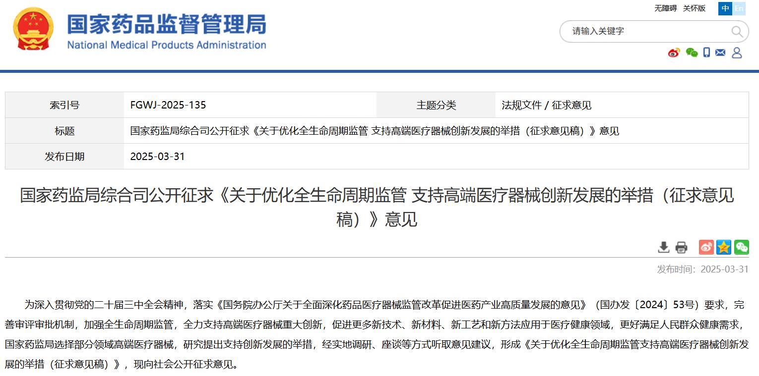 國家藥監(jiān)局綜合司公開征求《關于優(yōu)化全生命周期監(jiān)管 支持高端醫(yī)療器械創(chuàng)新發(fā)展的舉措(征求意見稿)》意見