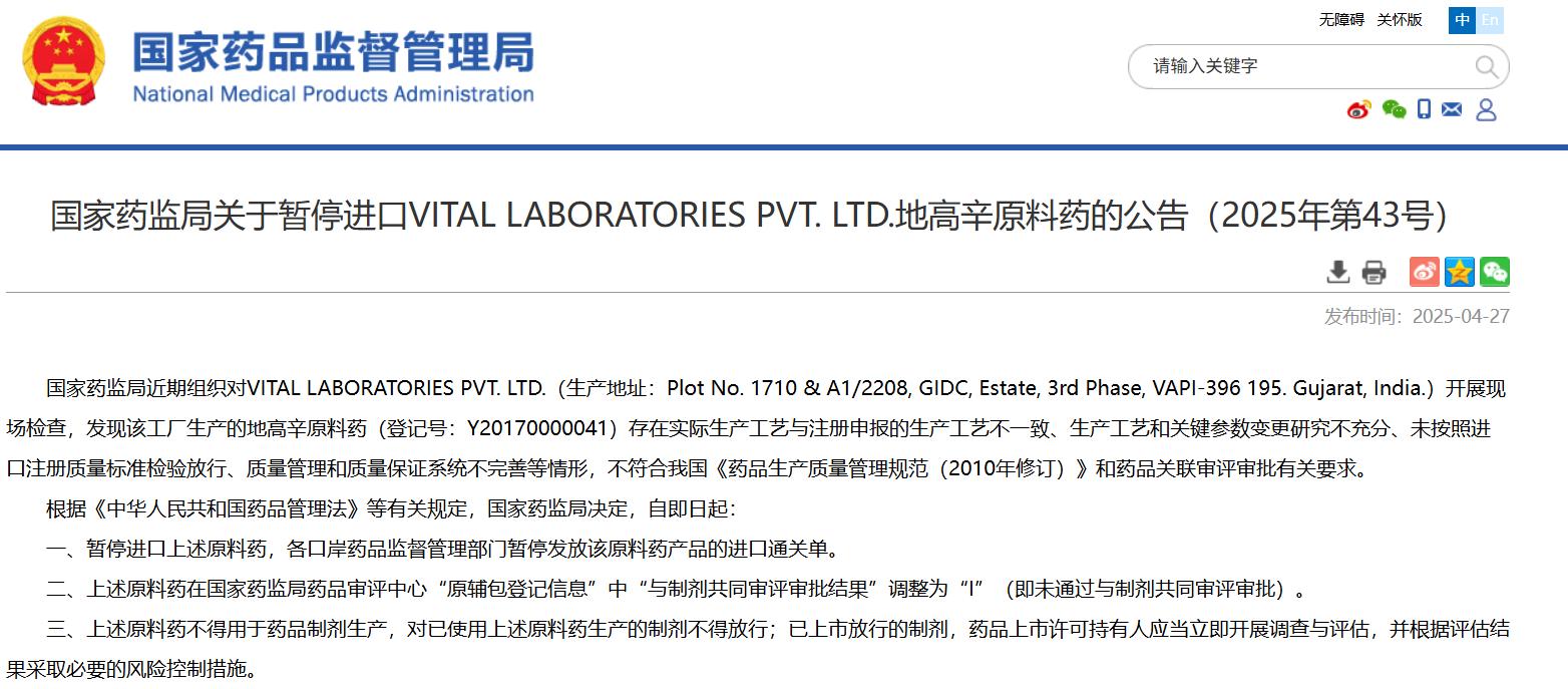 國家藥監(jiān)局關(guān)于暫停進(jìn)口VITAL LABORATORIES PVT. LTD.地高辛原料藥的公告(2025年第43號(hào))