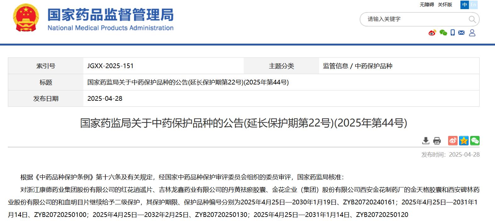 國家藥監(jiān)局關(guān)于中藥保護(hù)品種的公告(延長保護(hù)期第22號(hào))(2025年第44號(hào))