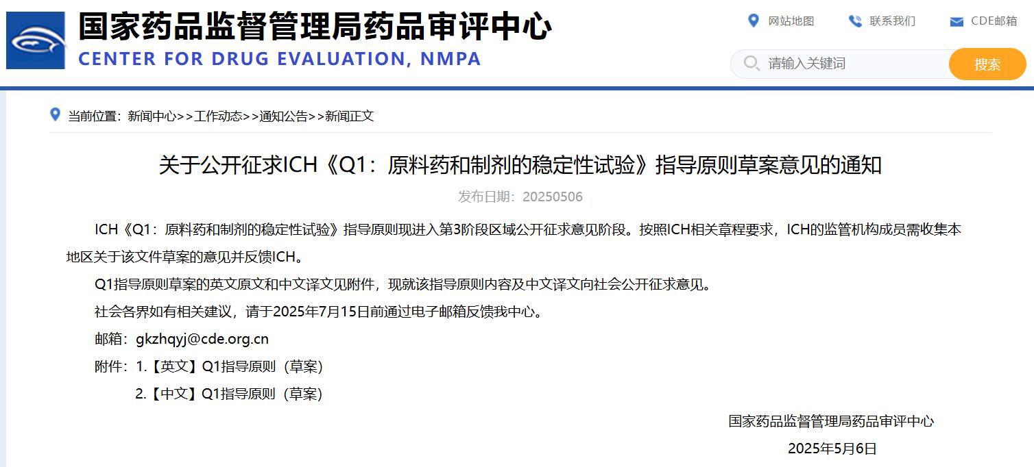 關于公開征求ICH《Q1:原料藥和制劑的穩(wěn)定性試驗》指導原則草案意見的通知