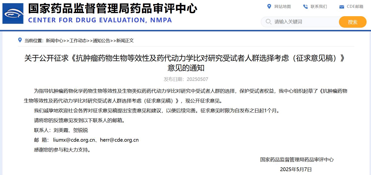 關于公開征求《抗腫瘤藥物生物等效性及藥代動力學比對研究受試者人群選擇考慮(征求意見稿)》意見的通知
