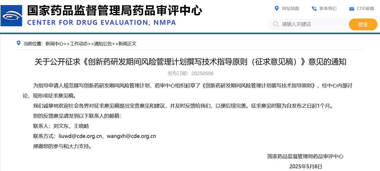 關于公開征求《創(chuàng)新藥研發(fā)期間風險管理計劃撰寫技術指導原則(征求意見稿)》意見的通知