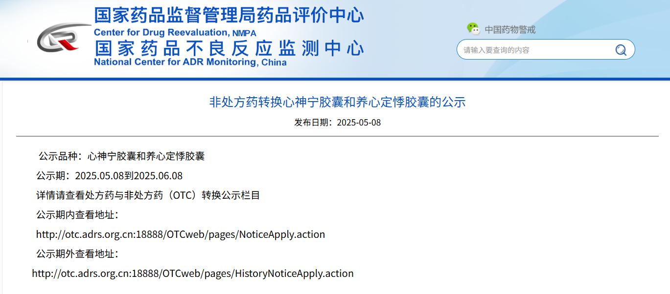 非處方藥轉換心神寧膠囊和養(yǎng)心定悸膠囊的公示