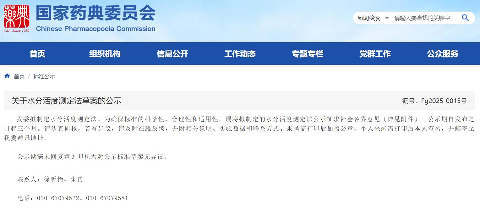 為確保標(biāo)準(zhǔn)的科學(xué)性、合理性和適用性,現(xiàn)將擬制定的水分活度測定法公示征求社會各界意見。