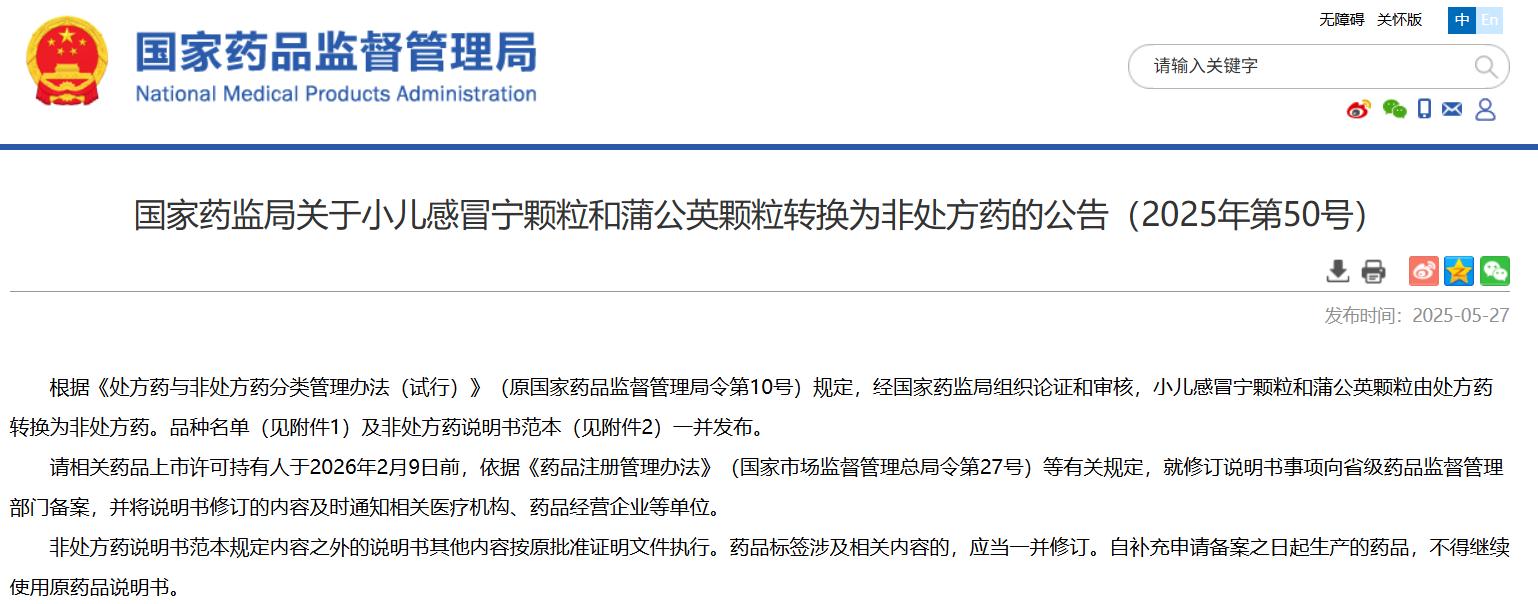 國家藥監(jiān)局關(guān)于小兒感冒寧顆粒和蒲公英顆粒轉(zhuǎn)換為非處方藥的公告(2025年第50號)