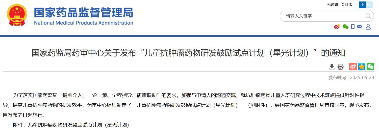 國家藥監(jiān)局藥審中心關(guān)于發(fā)布“兒童抗腫瘤藥物研發(fā)鼓勵試點計劃(星光計劃)”的通知