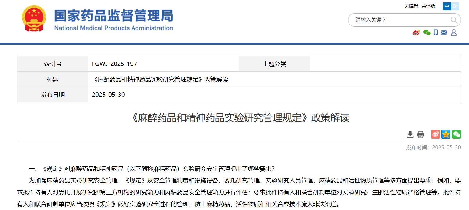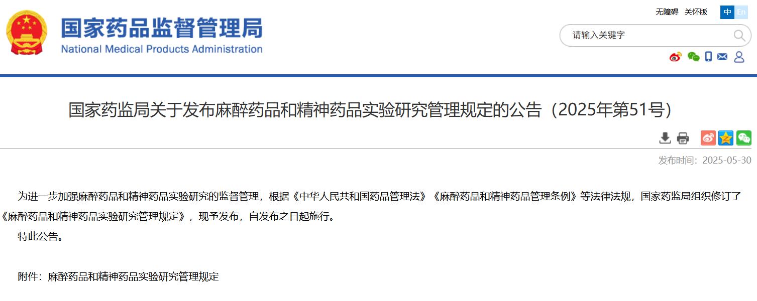 國家藥監(jiān)局關(guān)于發(fā)布麻醉藥品和精神藥品實驗研究管理規(guī)定的公告(2025年第51號)
