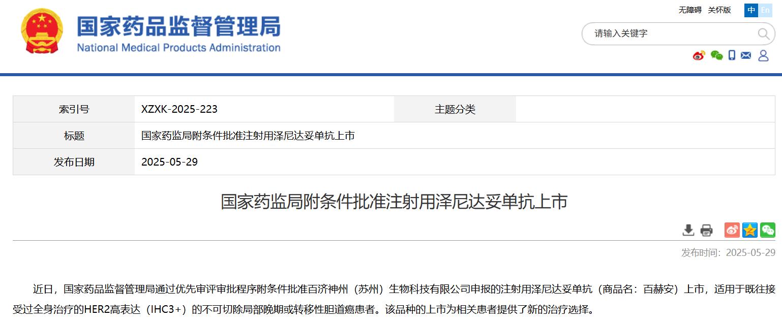 國家藥監(jiān)局附條件批準(zhǔn)注射用澤尼達妥單抗上市