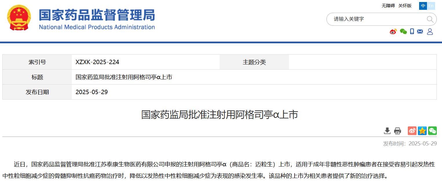 國家藥監(jiān)局批準(zhǔn)注射用阿格司亭α上市