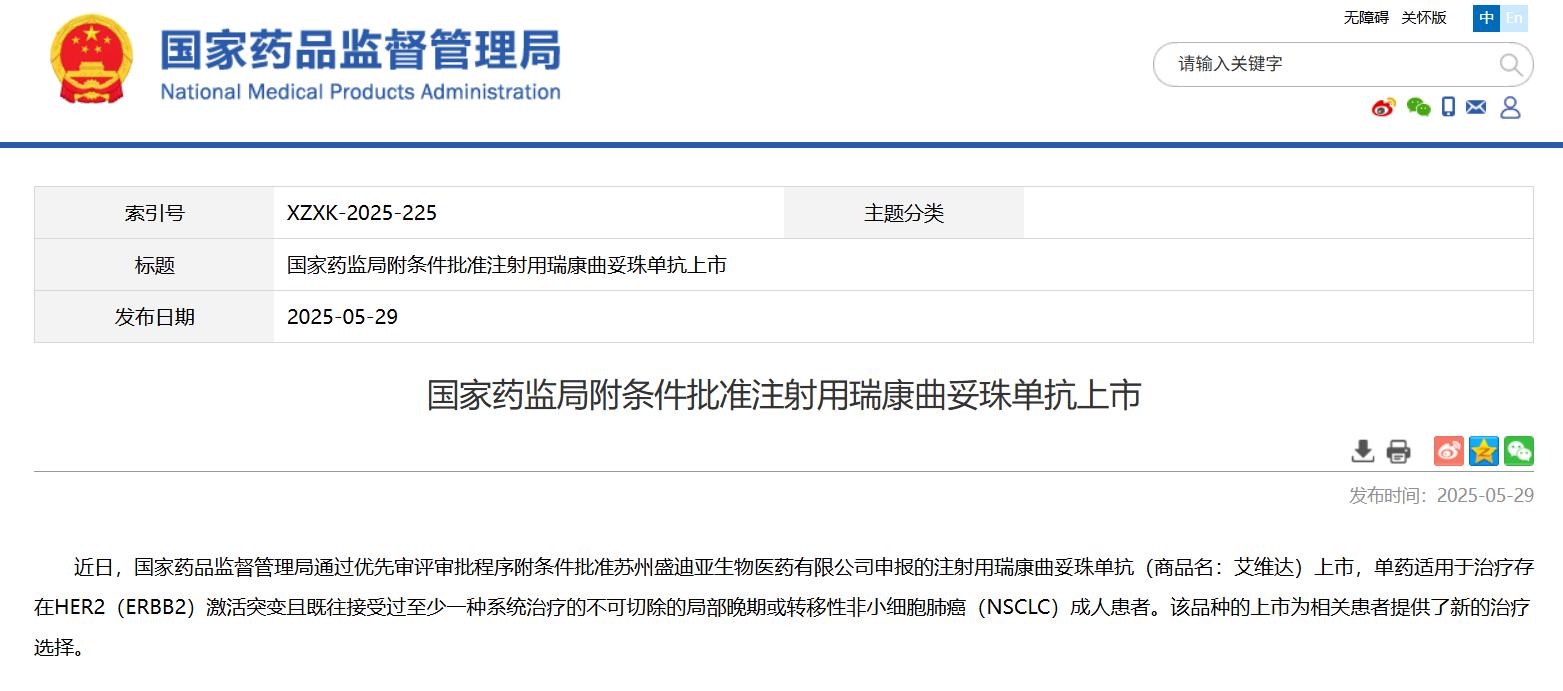 國家藥監(jiān)局附條件批準(zhǔn)注射用瑞康曲妥珠單抗上市
