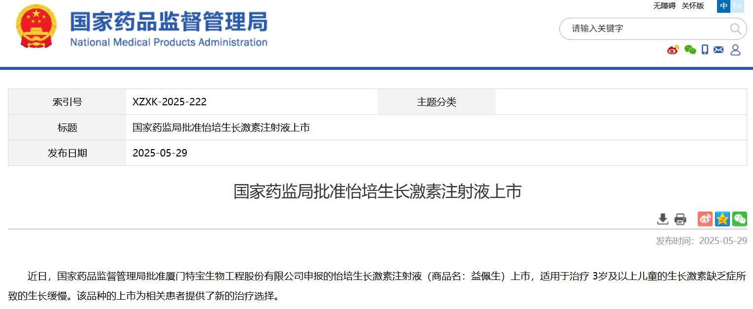 國家藥監(jiān)局批準(zhǔn)怡培生長激素注射液上市
