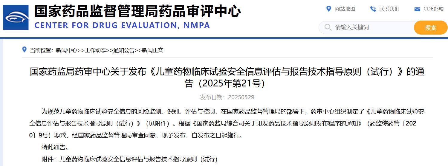 國家藥監(jiān)局藥審中心關(guān)于發(fā)布《兒童藥物臨床試驗安全信息評估與報告技術(shù)指導(dǎo)原則(試行)》的通告(2025年第21號)