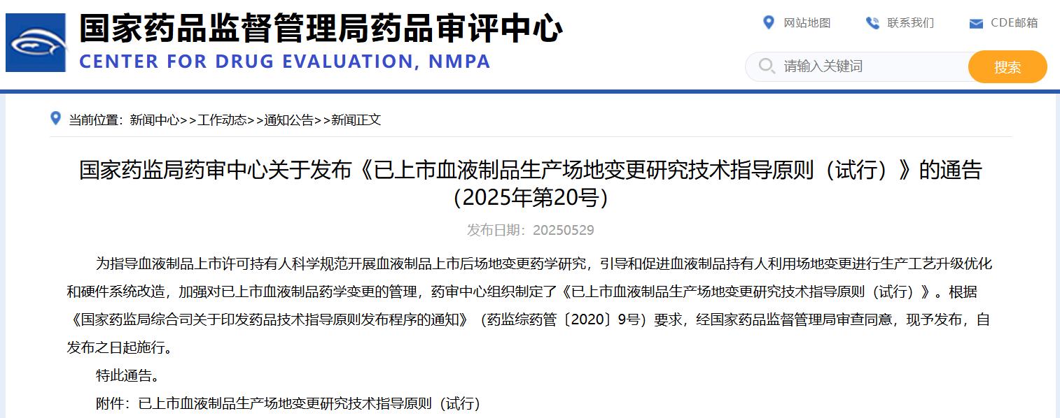 國家藥監(jiān)局藥審中心關(guān)于發(fā)布《已上市血液制品生產(chǎn)場地變更研究技術(shù)指導(dǎo)原則(試行)》的通告(2025年第20號)