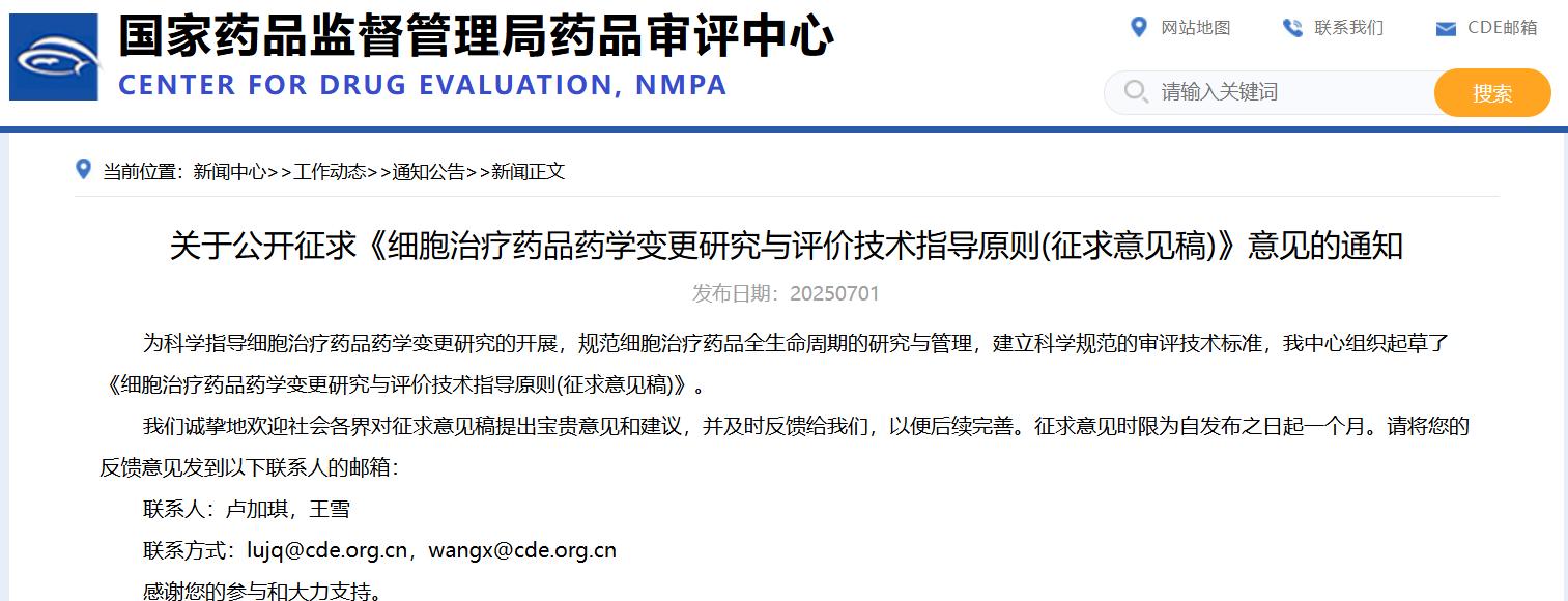 關(guān)于公開征求《細(xì)胞治療藥品藥學(xué)變更研究與評價技術(shù)指導(dǎo)原則(征求意見稿)》意見的通知