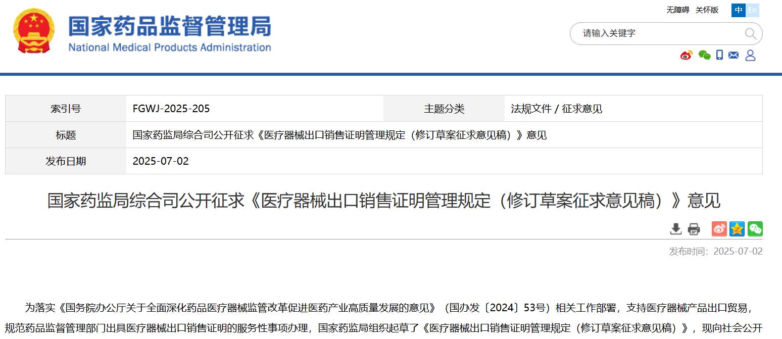 國家藥監(jiān)局綜合司公開征求《醫(yī)療器械出口銷售證明管理規(guī)定(修訂草案征求意見稿)》意見