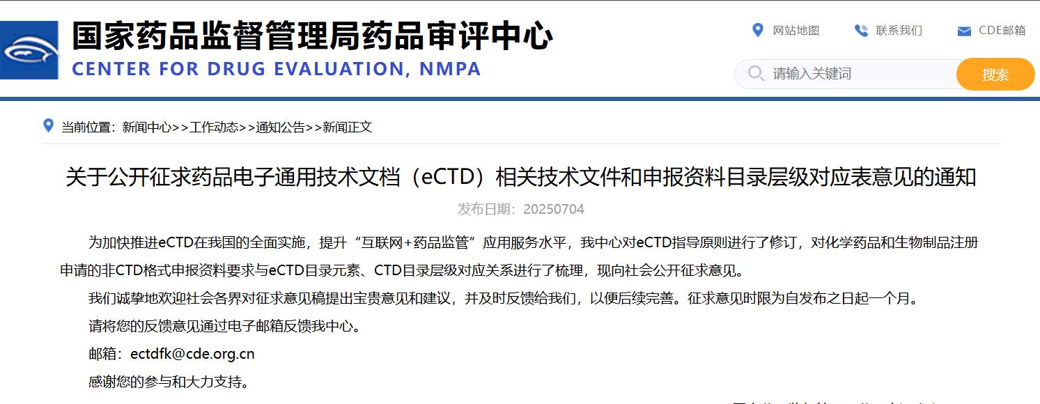 關(guān)于公開征求藥品電子通用技術(shù)文檔(eCTD)相關(guān)技術(shù)文件和申報資料目錄層級對應(yīng)表意見的通知