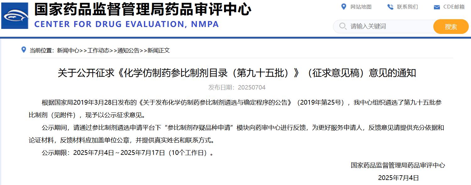 關(guān)于公開征求《化學仿制藥參比制劑目錄(第九十五批)》(征求意見稿)意見的通知