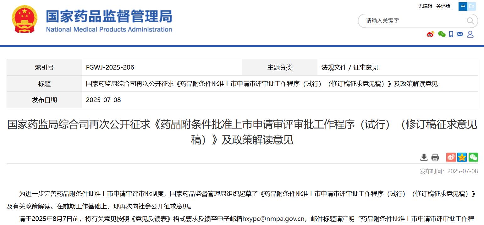 國家藥監(jiān)局綜合司再次公開征求《藥品附條件批準上市申請審評審批工作程序(試行)(修訂稿征求意見稿)》及政策解讀意見