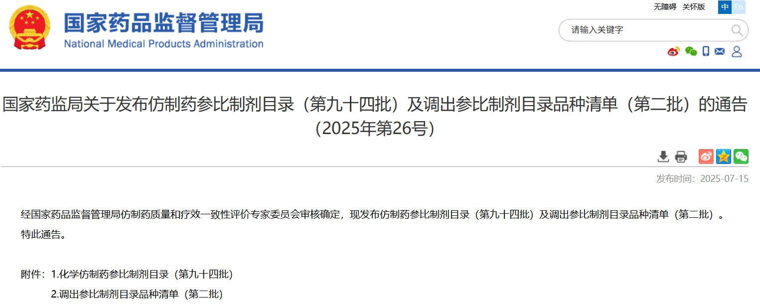 國(guó)家藥監(jiān)局關(guān)于發(fā)布仿制藥參比制劑目錄(第九十四批)及調(diào)出參比制劑目錄品種清單(第二批)的通告(2025年第26號(hào))