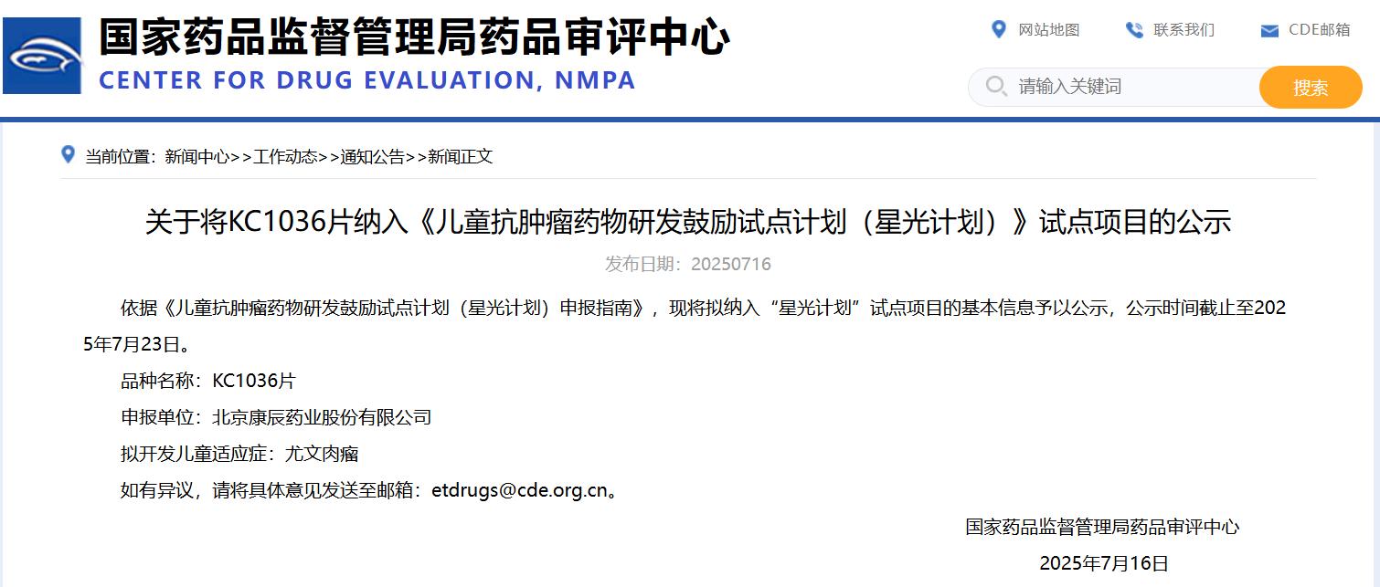 關(guān)于將KC1036片納入《兒童抗腫瘤藥物研發(fā)鼓勵(lì)試點(diǎn)計(jì)劃(星光計(jì)劃)》試點(diǎn)項(xiàng)目的公示