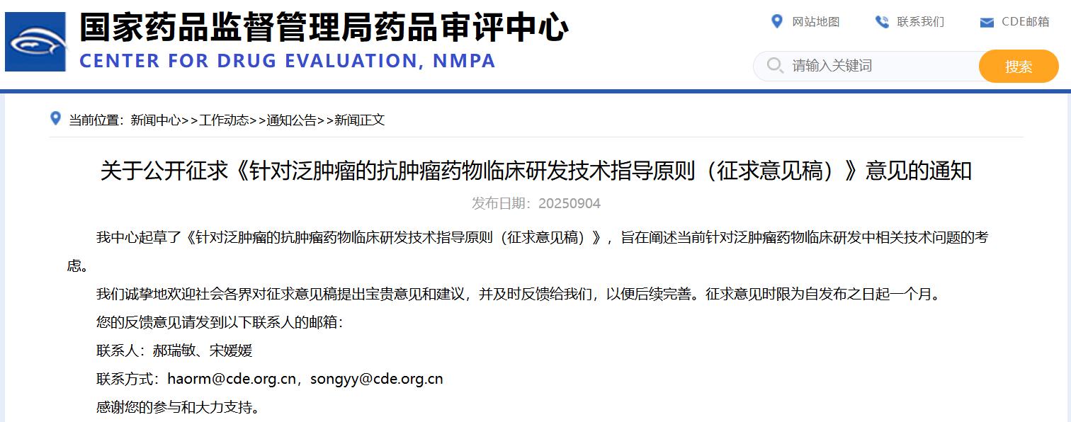 關(guān)于公開征求《針對泛腫瘤的抗腫瘤藥物臨床研發(fā)技術(shù)指導原則(征求意見稿)》意見的通知