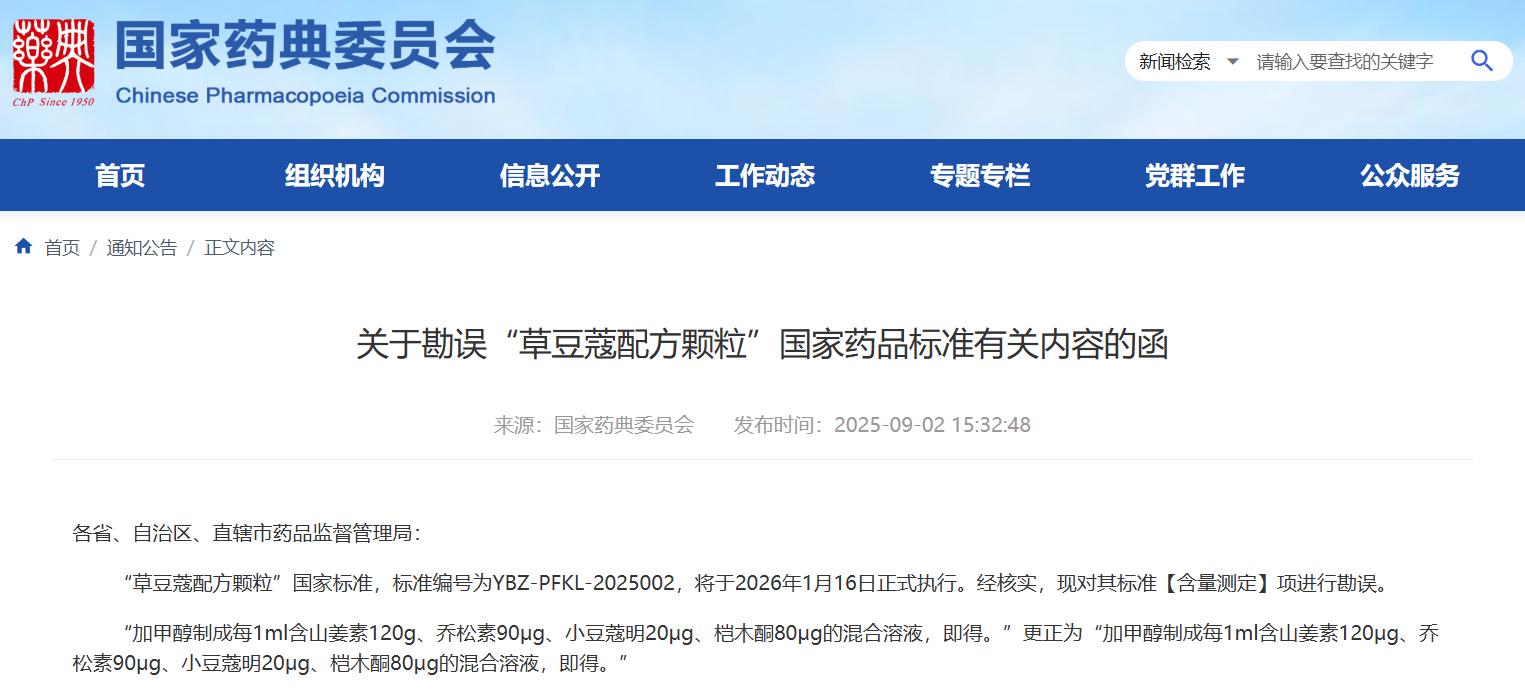 關(guān)于勘誤“草豆蔻配方顆粒”國家藥品標準有關(guān)內(nèi)容的函