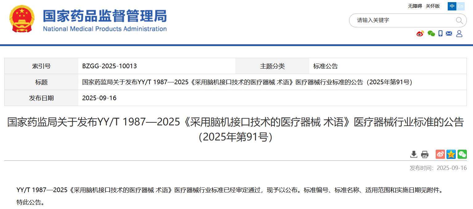 國家藥監(jiān)局關(guān)于發(fā)布YY/T 1987—2025《采用腦機接口技術(shù)的醫(yī)療器械 術(shù)語》醫(yī)療器械行業(yè)標準的公告(2025年第91號