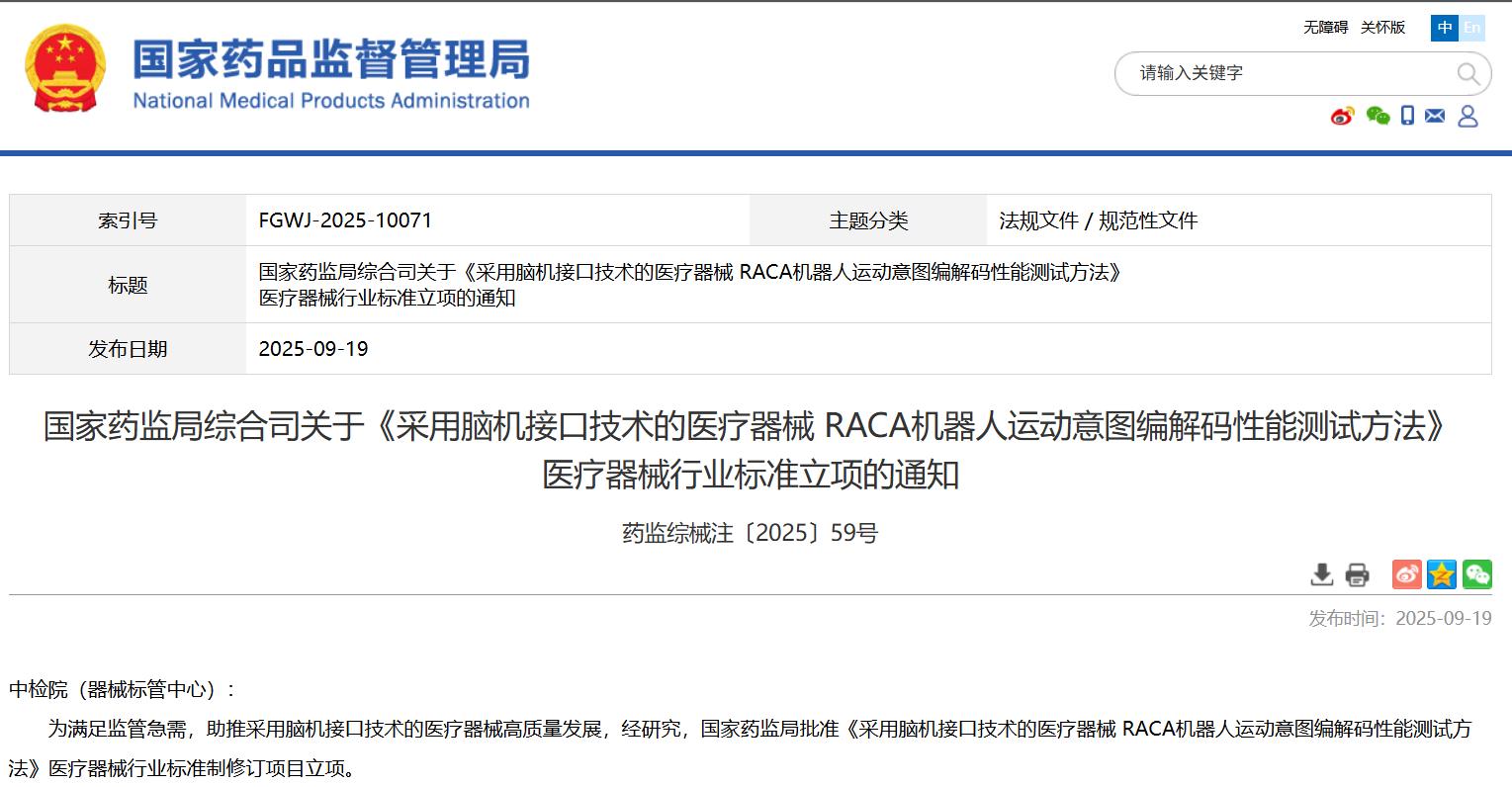 國家藥監(jiān)局綜合司關(guān)于《采用腦機接口技術(shù)的醫(yī)療器械 RACA機器人運動意圖編解碼性能測試方法》醫(yī)療器械行業(yè)標準立項的通知