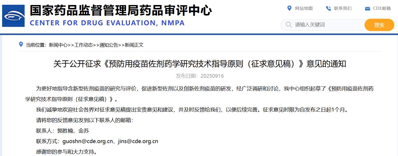 關(guān)于公開征求《預防用疫苗佐劑藥學研究技術(shù)指導原則(征求意見稿)》意見的通知