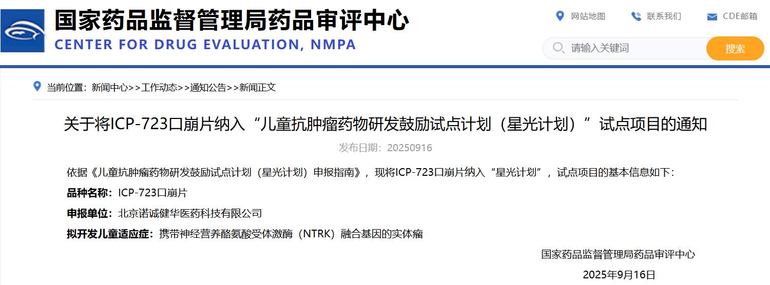 關(guān)于將ICP-723口崩片納入“兒童抗腫瘤藥物研發(fā)鼓勵試點計劃(星光計劃)”試點項目的通知
