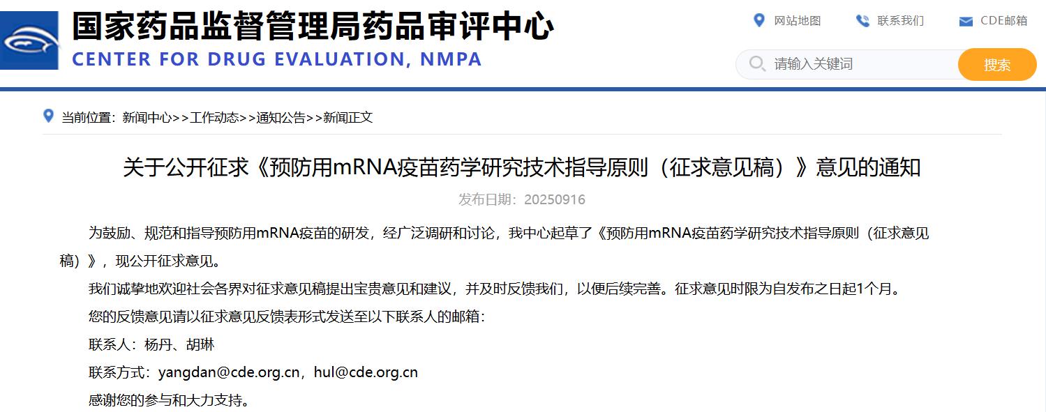 關(guān)于公開征求《預防用mRNA疫苗藥學研究技術(shù)指導原則(征求意見稿)》意見的通知