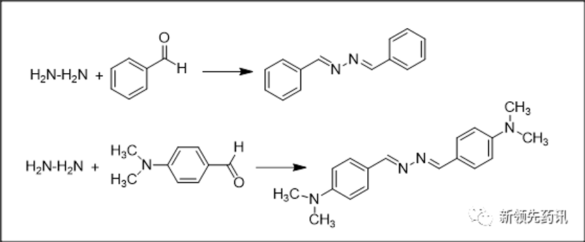 3)苯甲醛/對二甲基苯甲醛與肼反應(yīng)生成苯甲醛吖嗪/對二甲氨基芐連氮黃色化合物