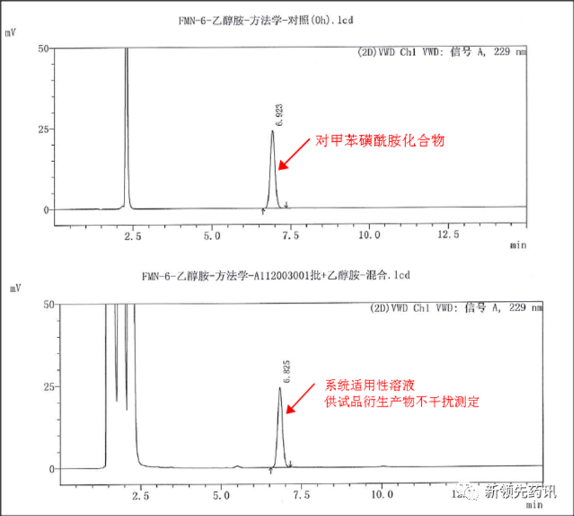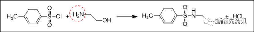 研究思路:需要對起始原料乙醇胺進行研究,該化合物無紫外吸收,GC響應(yīng)較弱,結(jié)構(gòu)為伯胺,考慮采用對甲苯磺酰氯衍生生成對甲苯磺酰胺化合物,引入較強共軛,可采用HPLC進行測定。
